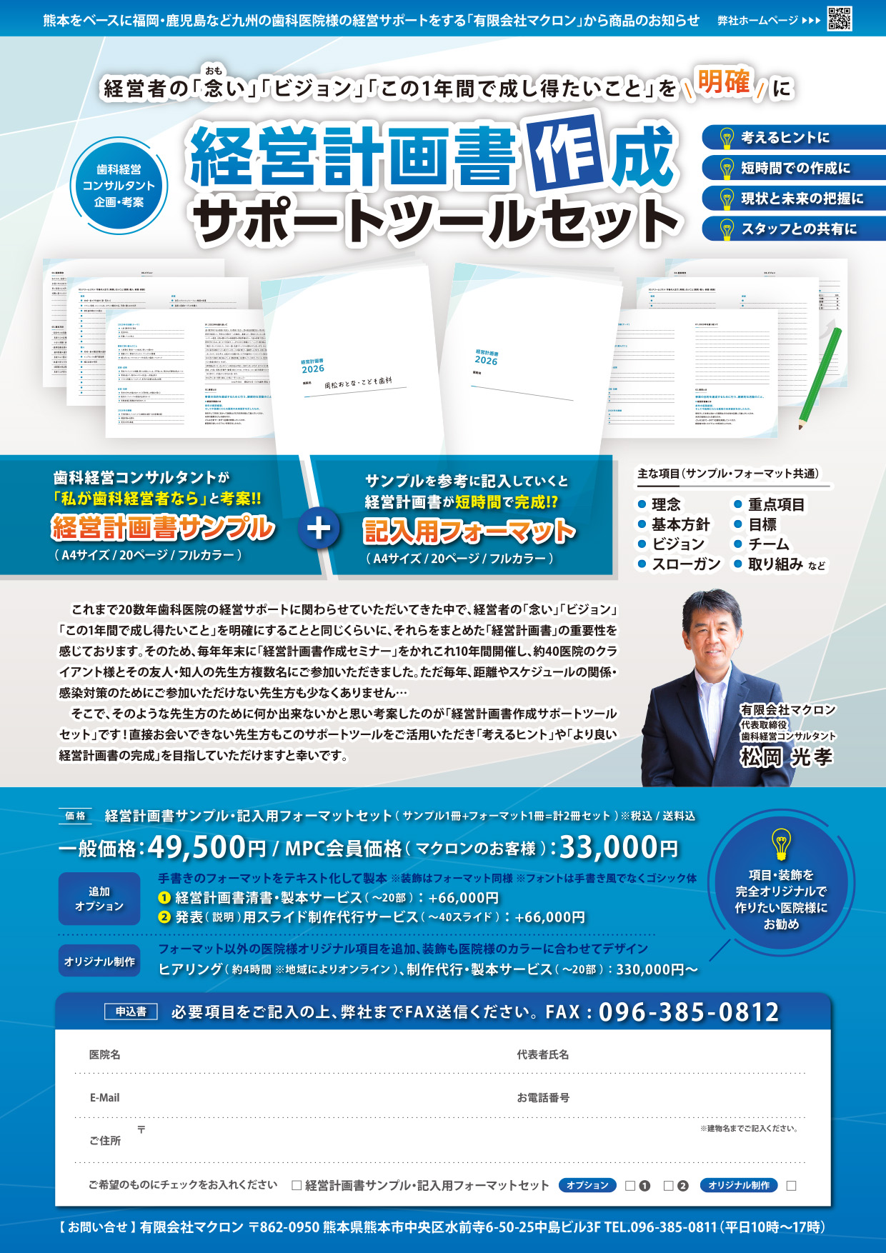 今年も残すところ約2ヶ月となりました。 来年の経営計画の準備は進んでいますか? ・どのように作成したらいいか分からない ・時間に余裕がないetc... そんなお悩みがある先生には、 弊社代表の歯科経営コンサルタントが考案いたしました、 「経営計画書作成サポートツール」をおすすめいたします! サンプルを参考にしながら、 フォーマットに記入していくことで 短時間で完成いたします。 きちんと作成することで、 スタッフさんとも共有しやすくなります^^【セット内容】 ・経営計画書フォーマット:1冊 ・経営計画書サンプル:1冊 ※A4サイズ/20ページ/フルカラー 【価格】※税/送料込 一般価格:49,500円 MPC会員価格:33,000円 追加オプションもございます! \ スタッフと共有したい / 【清書、製本サービス】 手書きのフォーマットをテキスト化し製本 +66,000円(~20部まで) 【スライド制作】 手書きのフォーマットを発表用スライドへ +66,000円(~40スライドまで) \ 医院オリジナルデザインにしたい / 医院様カラーに合わせて装飾デザイン フォーマットの内容以外の項目も追加できる 330,000円~ お申込みはチラシをFAXしていただくか、 メールまたはLINEでご連絡ください。 ご不明な点などございましたら、 お気軽にお問い合わせください。 お待ちしております☻