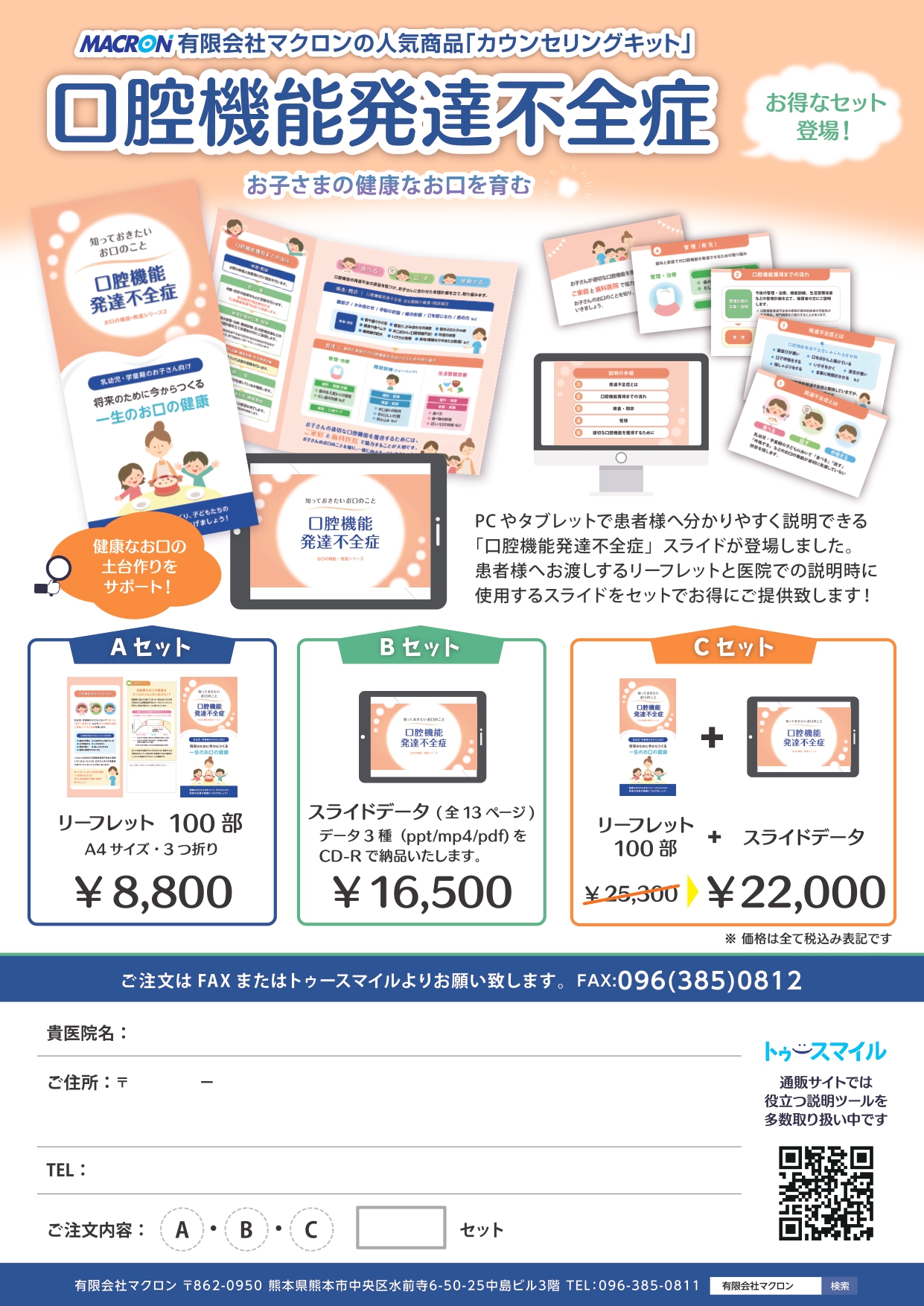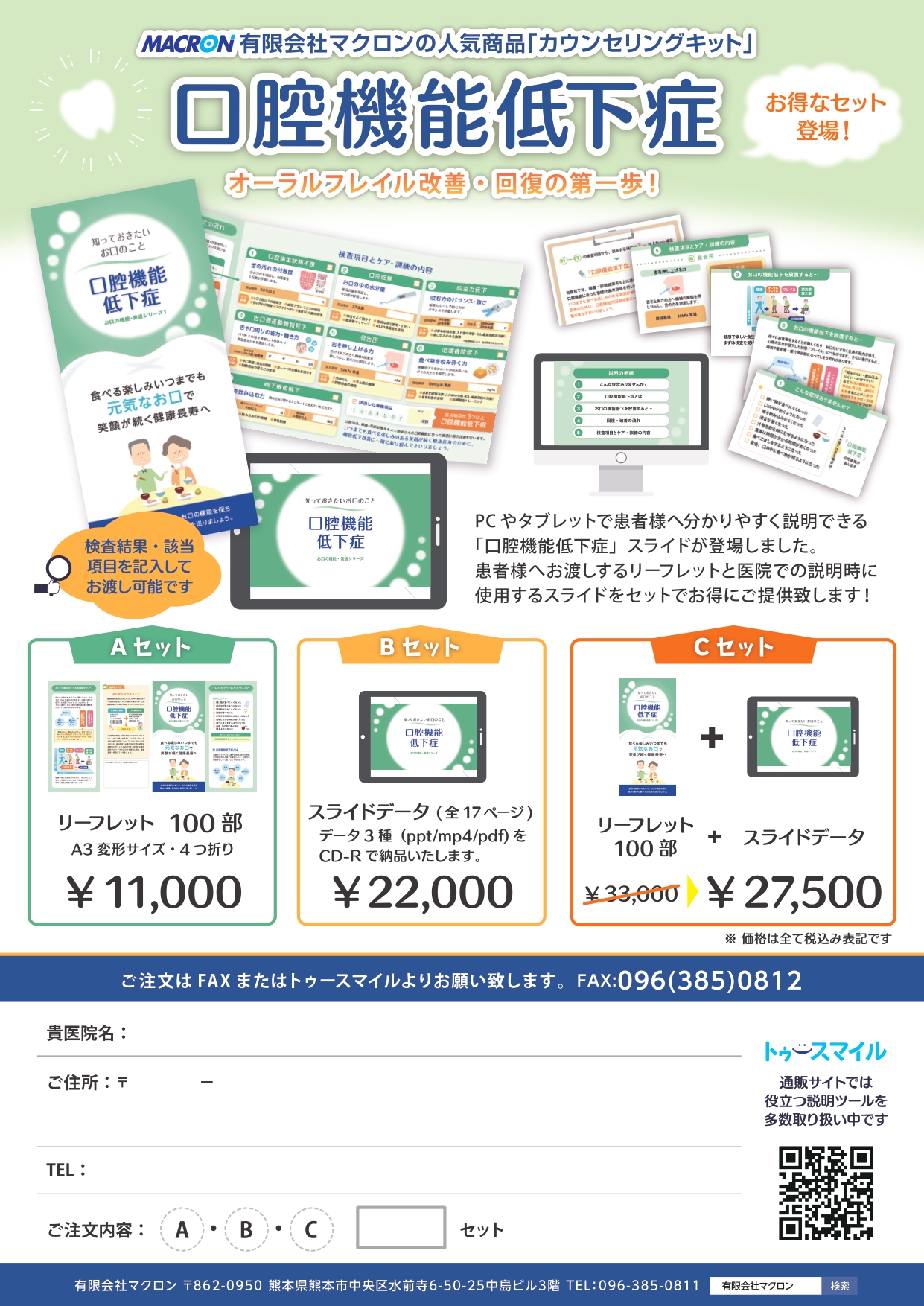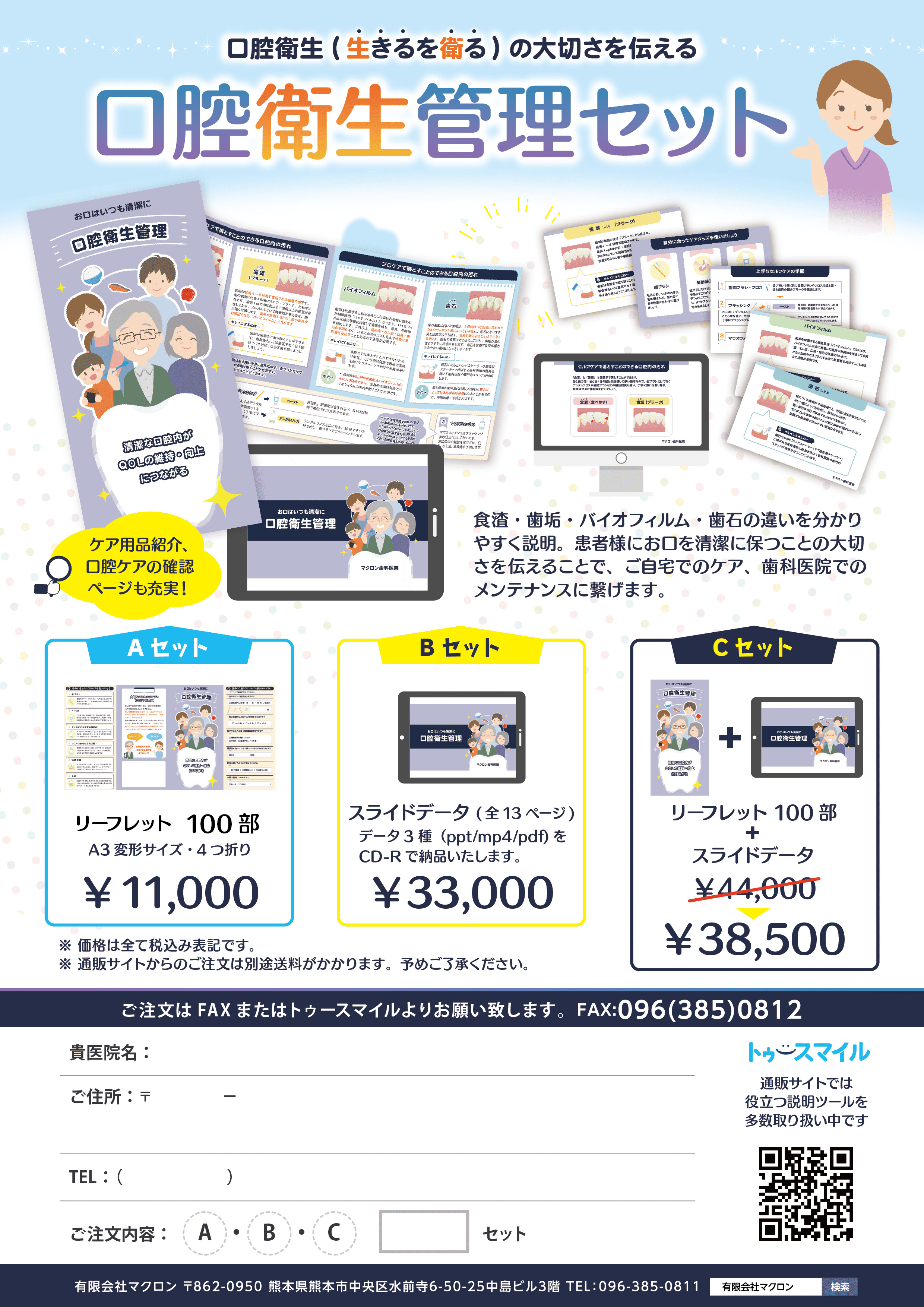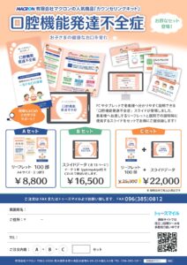 【サイズ】 A3変形サイズ・4つ折り 【価格】※税込表記 11,000円/100部 【ご注文】 オンラインショップ「トゥースマイル」 https://tooth-smile.com/products/detail/408 ※TEL/FAX/MAIL/LINEからのご注文も可能です (トゥースマイル以外からのご注文の場合、お支払いは「銀行振込のみ」となります) 【お問い合わせ】 TEL:096-385-0811(平日:10時~17時) FAX:096-385-0812 MAIL:support@macron.co.jp LINE:macron.staff