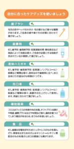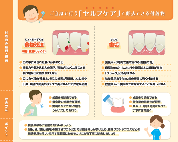 私が以前教えて頂いたのは、 歯磨きの時間が短い人(1〜2分間)は、エチケットブラッシングにて、 食渣と歯垢の違い「プラークコントロール」を理解しておられない。 【2】食渣と歯垢の違いの説明 出来れば染色後に手鏡にて口腔内を見て頂き、 「〇〇さん、こちらをご覧ください。この赤く染まっている部分は、何だと思われますか?」 『汚れですか?』 「いえ、歯垢(プラーク)です。歯ブラシが上手く当たっていない所に歯垢が残っています。 残ったままだと、むし歯・歯周病の原因となります。」 『それは困ります。どうしたら綺麗に落とせますか?』 「プラーク除去率の高い歯ブラシの使用と 歯磨き(ブラッシング)の仕方を変えて頂くと綺麗に落とせると思います。」 『教えて下さい!』 「はい、有難う御座います。その前にこちらをご覧ください。」 と伝え、リーフレット中面の左側「食渣と歯垢の違い」を説明します。・食渣・歯垢とは、どういうものか ・キレイにするには、どのようにするのか 【3】ケア用品の処方