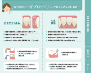このような方は、とても意識高いですよね、 プラークコントロールを再認識して頂くのと同時に、 セルフケアで不十分な所を補うプロケアの説明をします。 【5】バイオフィルムと歯石の説明・バイオフィルム・歯石とはどういうものか ・キレイにするには、どのようにするのか 【6】正しいブラッシングの手順