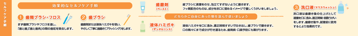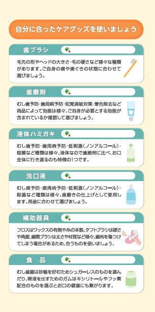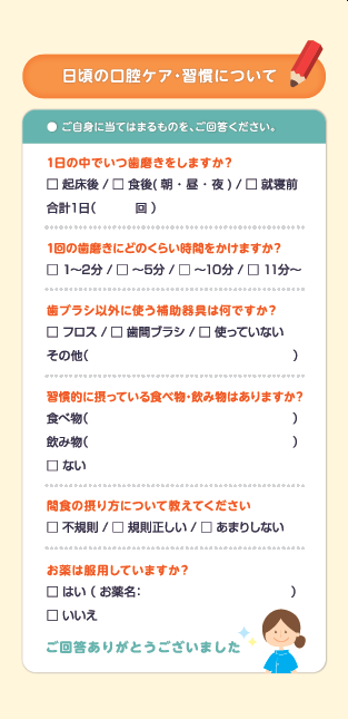 1.歯磨きのタイミングと回数 2.歯磨きに要する時間 3.歯ブラシ以外の清掃用具の使用の有無 4.日常的に摂る飲食物 5.間食の有無、タイミング 6.服用の有無