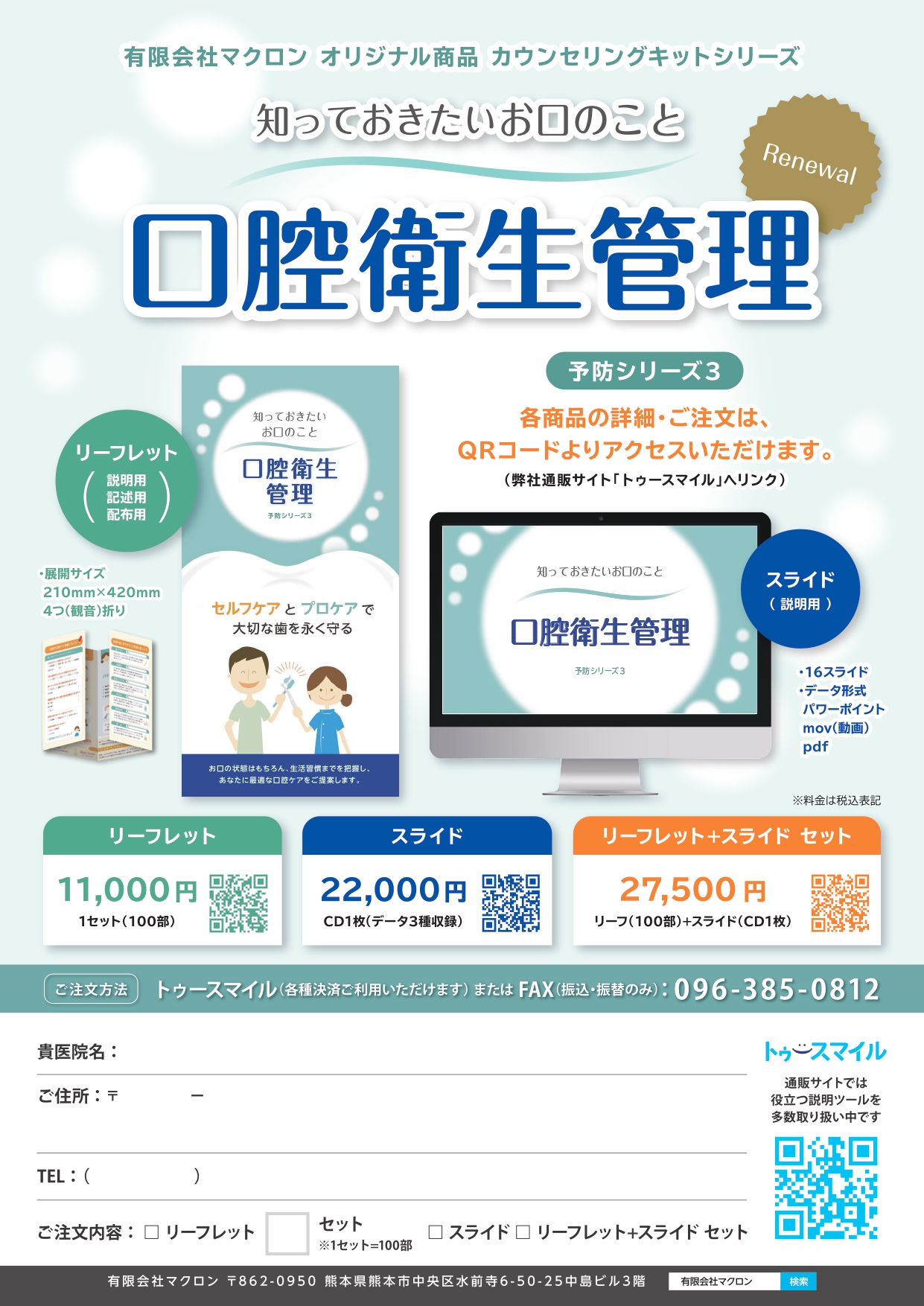 定期検診の継続を促します。 お口の健康が全身の健康に繋がり、健康長寿を実現する。 再度の動機づけに使用して頂ければ幸いです。 またケア用品の売上げ向上にも貢献できれば、この上ない喜びです。 ぜひご活用されてみて下さい。 この商品「口腔衛生管理リーフレット」は、マクロンの自信作です! 詳しい商品内容のご確認やご注文は、 オンラインショップ「トゥースマイル」よりお願いいたします。 ・リーフレット:https://tooth-smile.com/products/detail/413 ・スライド:https://tooth-smile.com/products/detail/414 ・リーフレット+スライド:https://tooth-smile.com/products/detail/415 何卒、宜しくお願い致します!